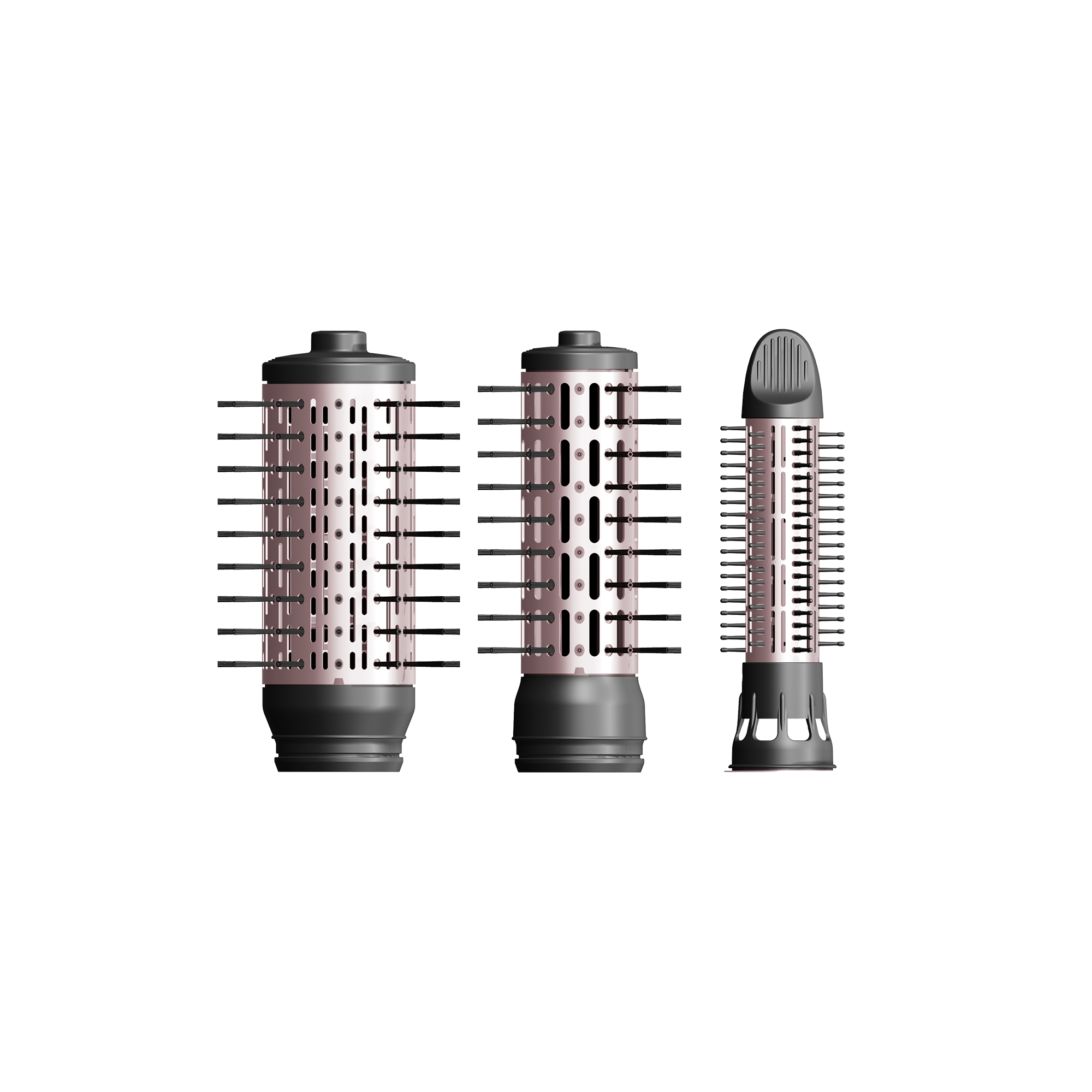 ویژگی منحصربه‌فرد این دستگاه با رنگ رزگلد، وجود سه سری متنوع است: برس شانه‌ای متحرک با قابلیت جمع شدن شانه‌ها (قابل‌استفاده به‌عنوان یک سشوار خانگی معمولی)، برس گرد باریک برای ایجاد فرهای ظریف و حالت‌های کرلی و برس گرد پهن برای براشینگ حرفه‌ای و حجم‌دهی به مو. همین تنوع سری‌ها با رنگ جذابش، دستگاه سشوار را هم برای براشینگ روزانه در خانه و هم برای شینیون حرفه‌ای در سالن‌های زیبایی به انتخابی عالی تبدیل می‌کند.