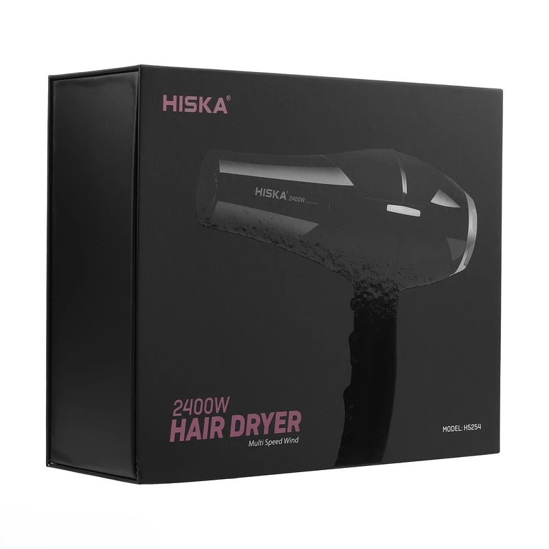 همه‌ی این‌ها از HISKA H5254 یک سشوار حرفه‌ای برای خشک‌کردن سریع و دادن حالت دلخواه به موها ساخته است. بدنه‌ی آن از جنس پلاستیک با‌کیفیت به رنگ مشکی است که در بالای دسته‌ی آن، دکمه‌ی باد سرد برای تثبیت حالت مو در‌نظر گرفته‌شده است. پایین‌تر از آن دکمه‌ای برای انتخاب سه حرارتِ کم، متوسط و زیاد قرار دارد که بسته به جنس مو توسط فرد تنظیم می‌شود. پایین‌ترین دکمه هم امکان تنظیم سرعت باد در دو حالت مختلف را در اختیار شخص قرار می‌دهد.این محصول دو متمرکز‌کننده دارد که یکی از آن‌ها باریک‌تر است و باد را با فشار بیشتری به بیرون هدایت می‌کند.