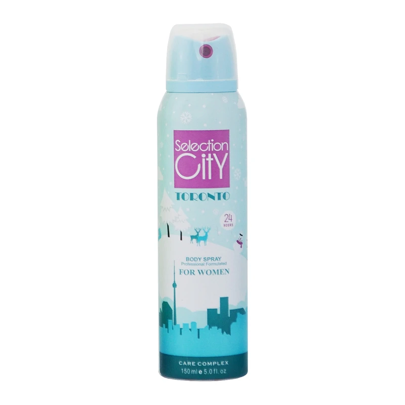 اسپری های جدید 150 میلی لیتری سلکشن سیتی با یازده رایحه منحصر بفرد که حال و هوای شهر های زیبای جهان را برای ما به ارمغان می آورد. این اسپری ها با ماندگاری 24 ساعته برای خانم ها و اقایان ساخته شده است که جذابیت شما را به وسعت شهر های زیبای جهانی میرساند. اسپری خوشبو کننده بدن زنانه مدل تورنتو 150میل سلکشن سیتی دارای ماندگاری بالا میباشد که استفاده از آن باعث می شود تا در طول روز بدن شما خوشبو باشد. همچنین پخش بوی عالی این اسپری باعث می شود تا در هر مکانی که حضور دارید همگان متوجه رایحه ی اسپری بدن شما شوند. فرمولاسیون این محصول ضد حساسیت بوده و به هیچ عنوان حتی برای پوست های حساس ایجاد آلرژی یا حساسیت نمی کند. استفاده از این اسپری به کاهش تعریق بدن نیز کمک میکند.